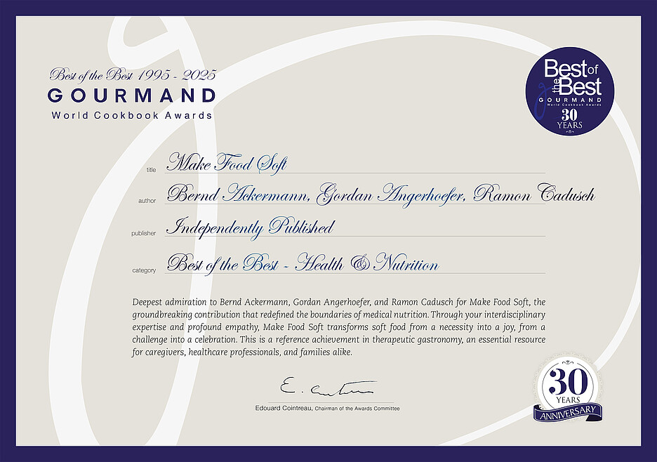 «Tiefste Bewunderung für Bernd Ackermann, Gordan Angerhoefer und Ramon Cadusch für Make food soft, den bahnbrechenden Beitrag, der die Grenzen der medizinischen Ernährung neu definiert hat. Dank eurer interdisziplinären Expertise und profunden Empathie verwandelt Make food soft weiche Nahrung von einer Notwendigkeit in eine Freude, von einer Herausforderung in ein Fest. Es ist eine Referenz in der therapeutischen Gastronomie, eine unverzichtbare Ressource für Pflegefachkräfte, medizinisches Fachpersonal und Familien gleichermassen.»