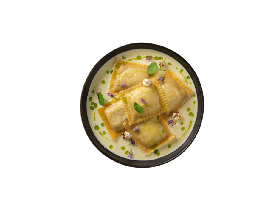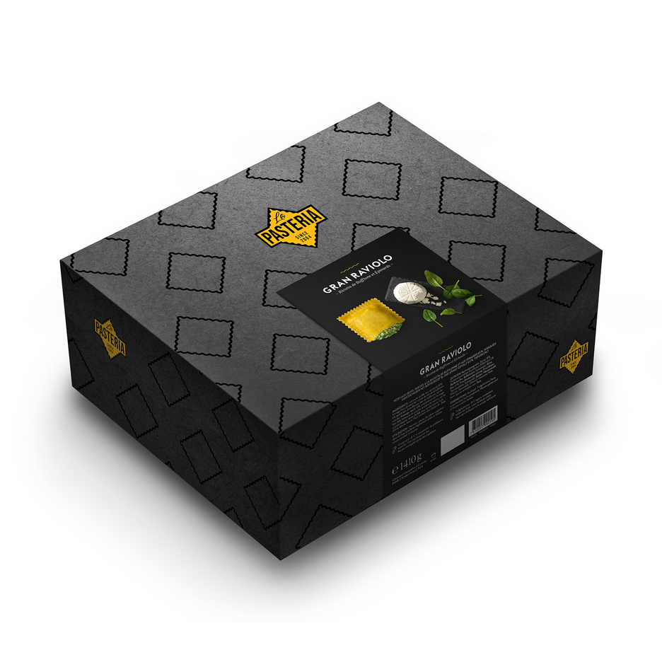 Die Pasta wird in der exklusiven Grossform «Gran Raviolo» angeboten. Mit einer Füllung von 60 Prozent und einem fein gearbeiteten Acht-Eierteig aus Hartweizengriess und flüssigem Freilandei, überzeugt sie durch ihre warme Farbgebung, raue Oberfläche und Al-dente-Textur. Jeder Biss vermittelt Authentizität und Qualität – ein Fundament für kreative Pasta-Kompositionen.