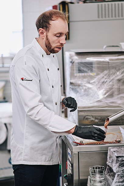 Leon Krohn von der Callebaut Chocolat Academy Switzerland liess die jungen Profis in die Welt verführerischer Schokoladenfüllungen eintauchen – von fruchtigen Karamells über zarte Ganaches bis zu karamellisierten Nüssen. Er demonstrierte, wie schon kleine Temperaturunterschiede die Textur einer Füllung verändern und welche Rolle präzises Arbeiten für die Qualität spielt.